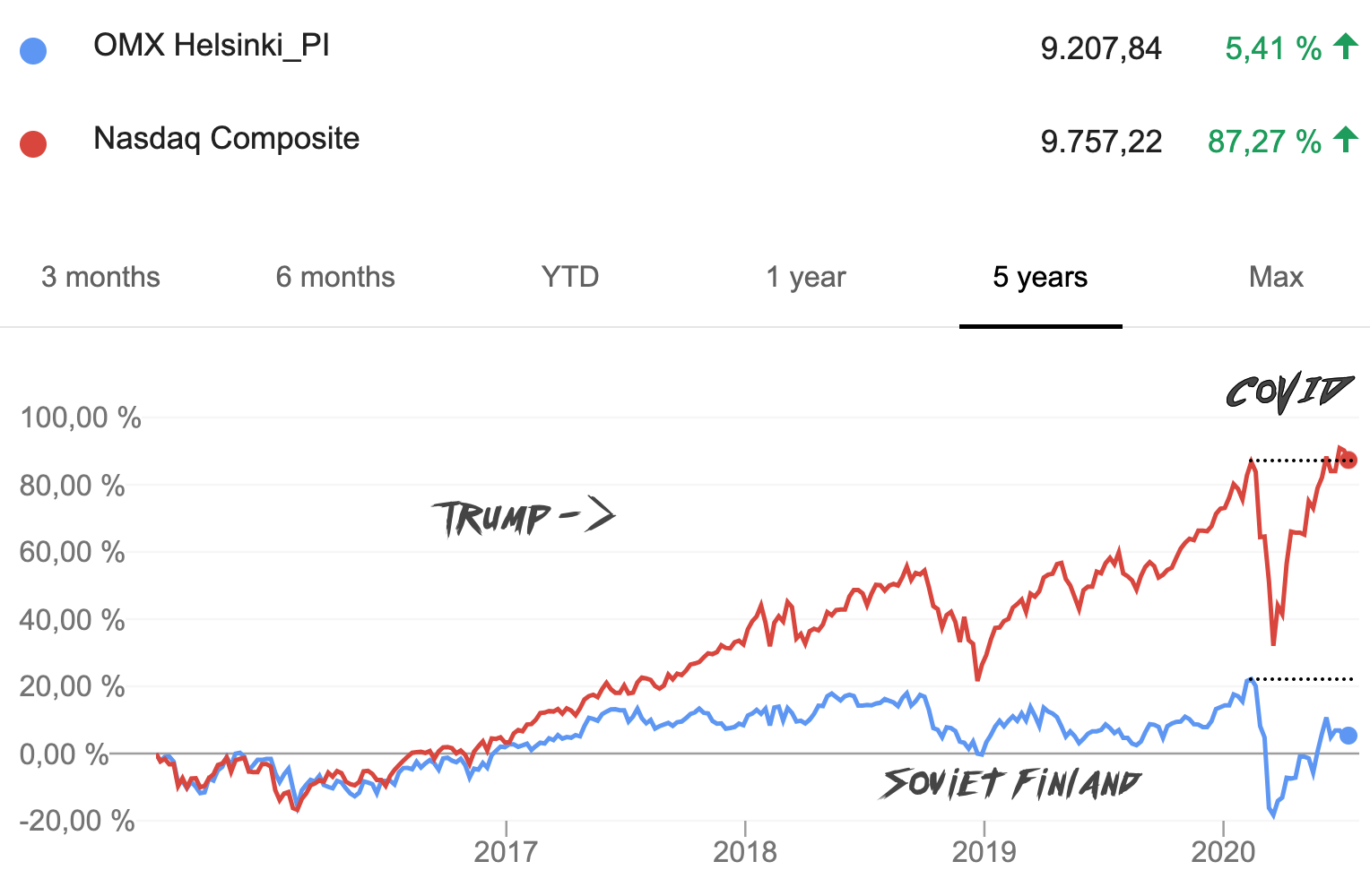 Kannattaa lukea valemedian lisäksi myös oikeita uutisia. Trump on osoittautunut olevansa kykenevä paitsi toteuttamaan vaalilupauksiaan, myös ajamaan koko yhteiskunnan etua. Talouskasvu on ollut valtavaa ja työttömyys minimaalista. Jopa koronasta palaaminen on onnistunut huomattavan hyvin https://zi.fi/Nasdaq-OMXH.png
